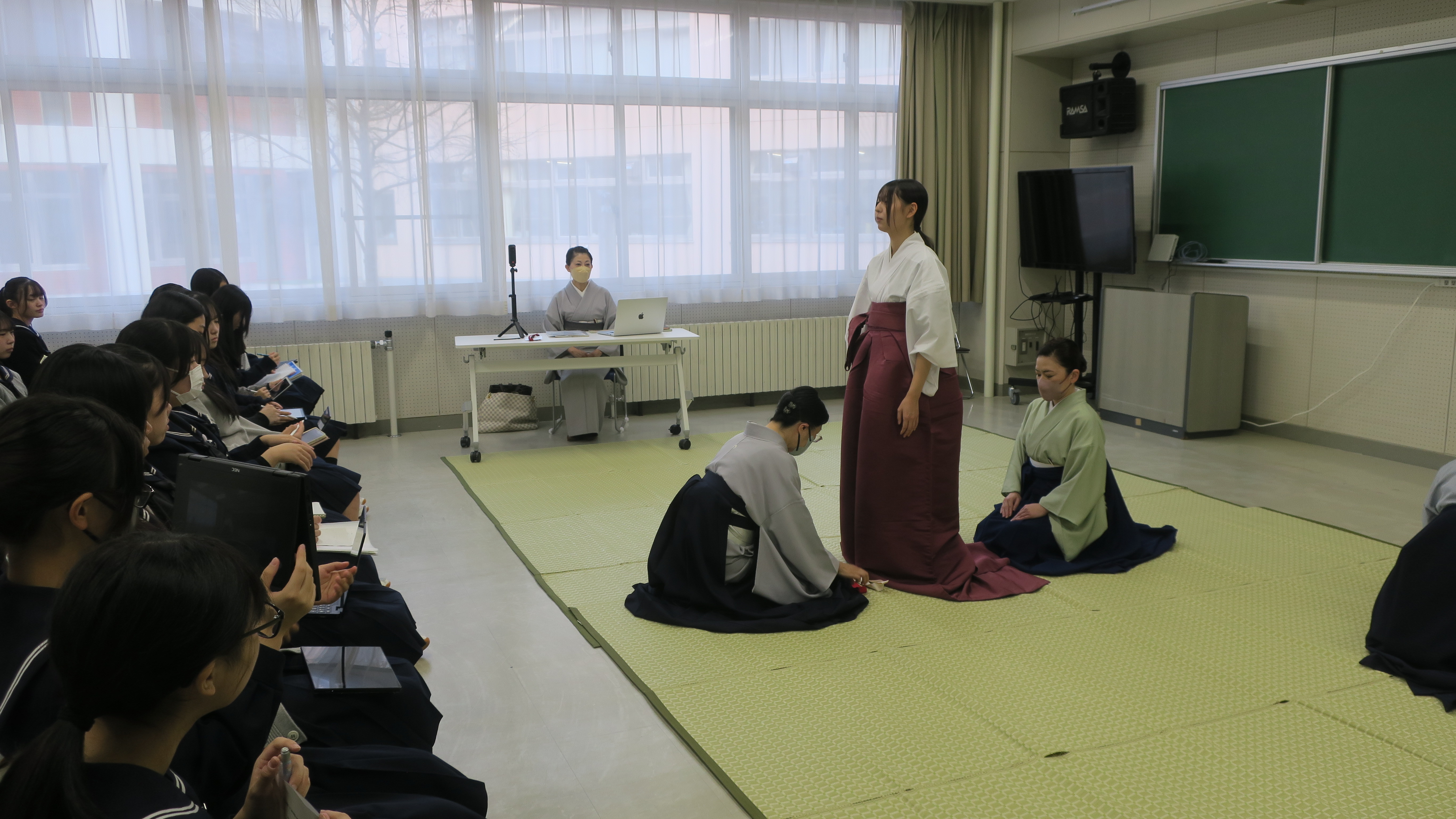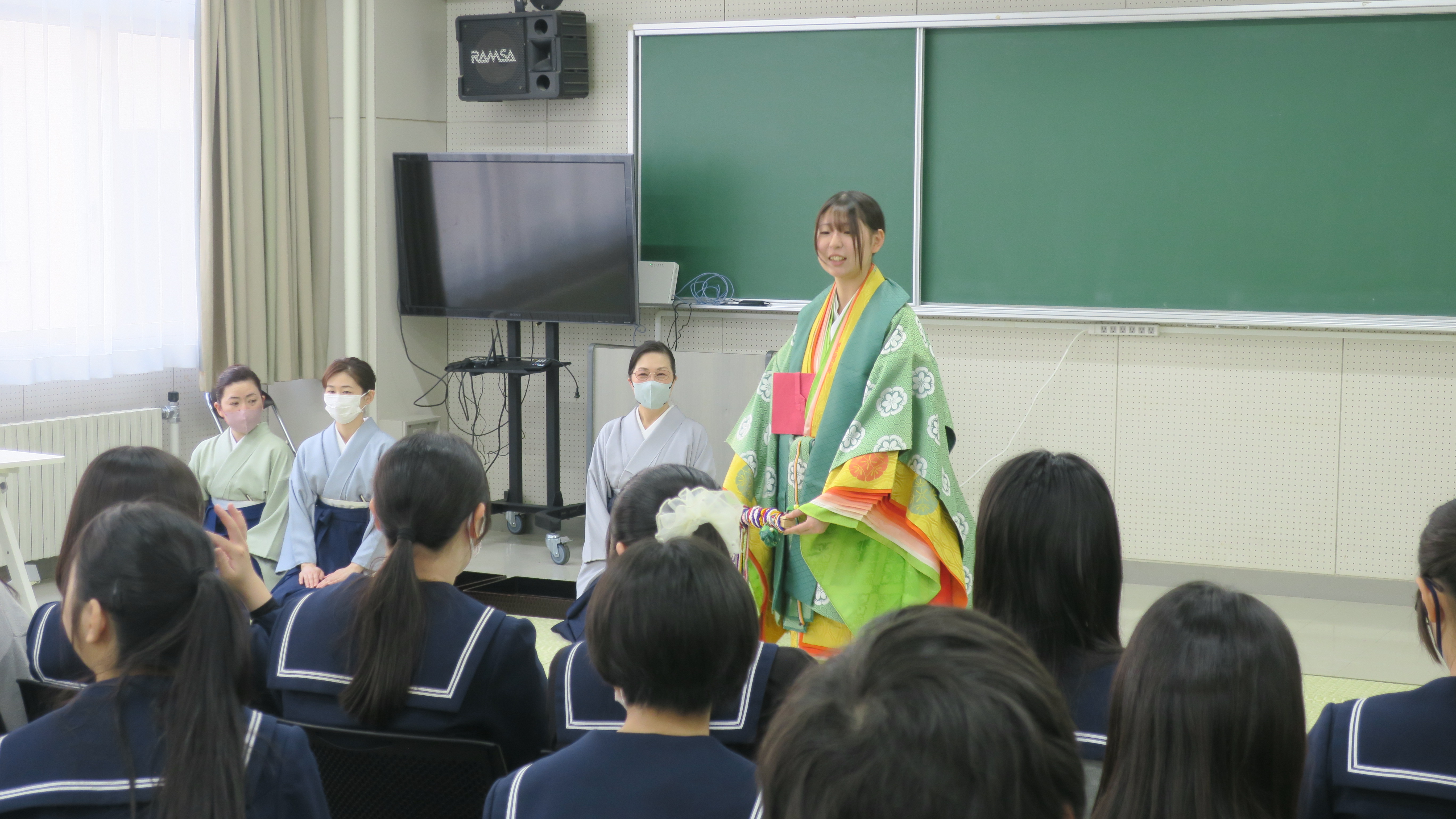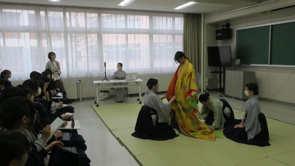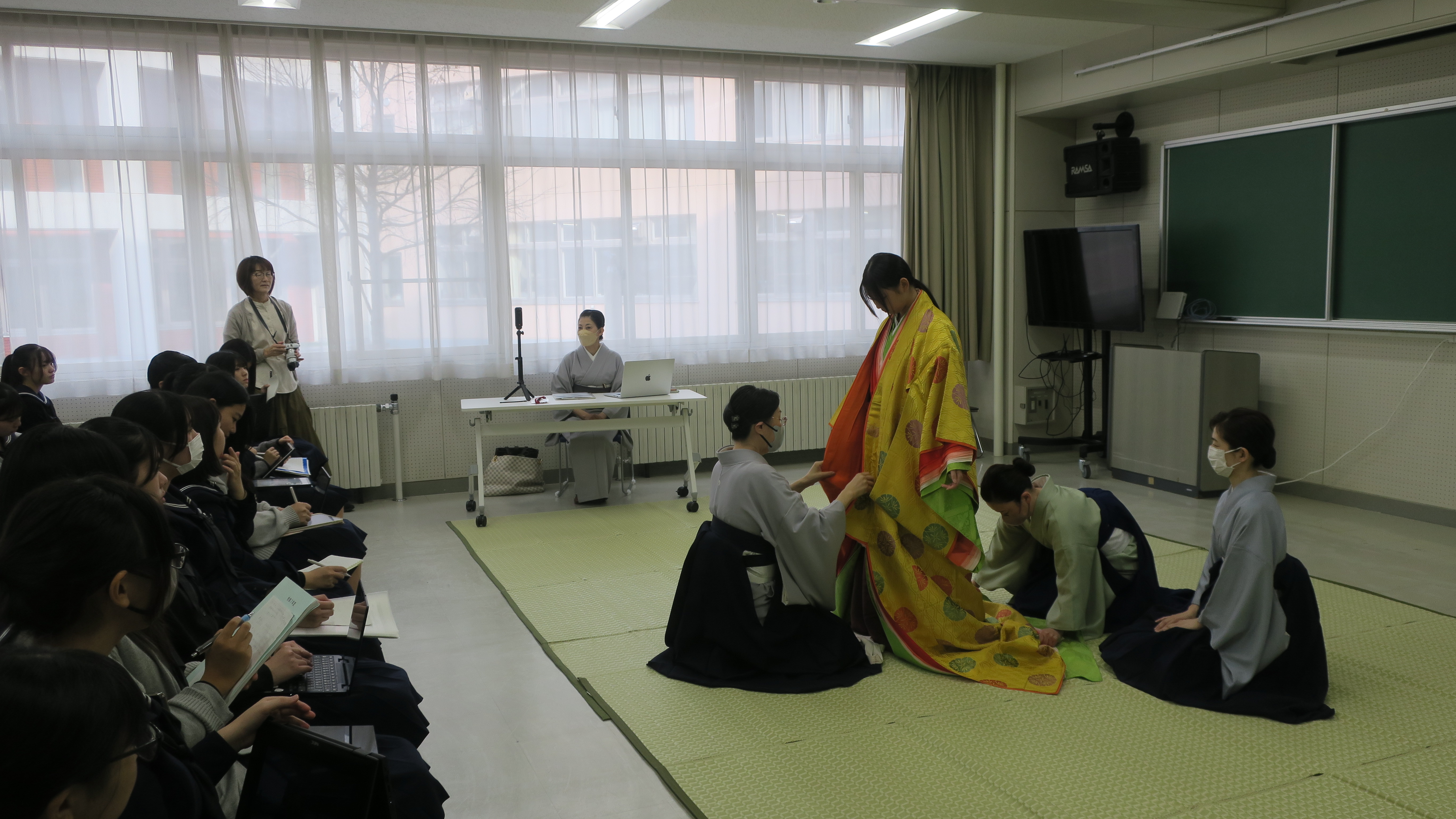北海道江別高等学校にて「十二単着装体験授業」を実施しました。